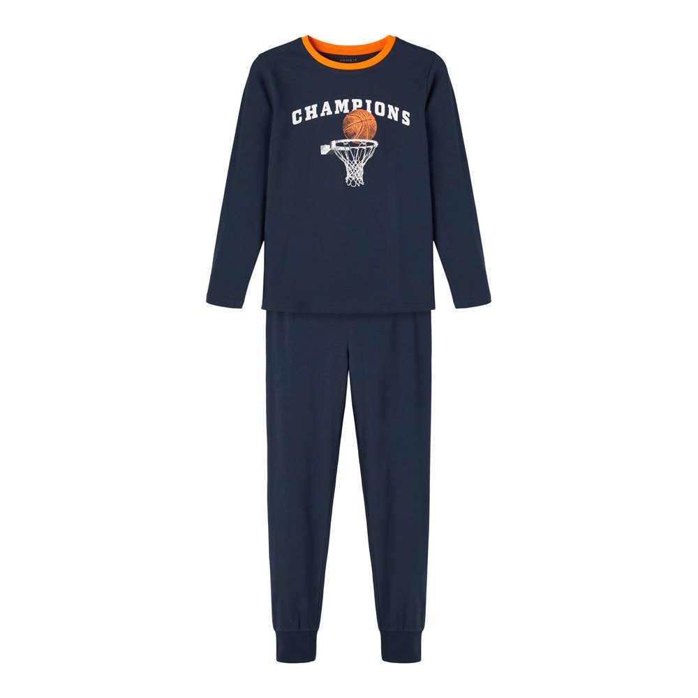 2-delt pysj med trøye og bukse med basketball-motiv. Kul med oransje kontrast mot mørk bunn.