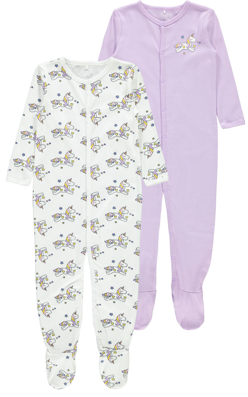 Pysj i 2-pk med fot. Pysjene lukkes med knepping. En med print på hele, og en med lite print på brystet.