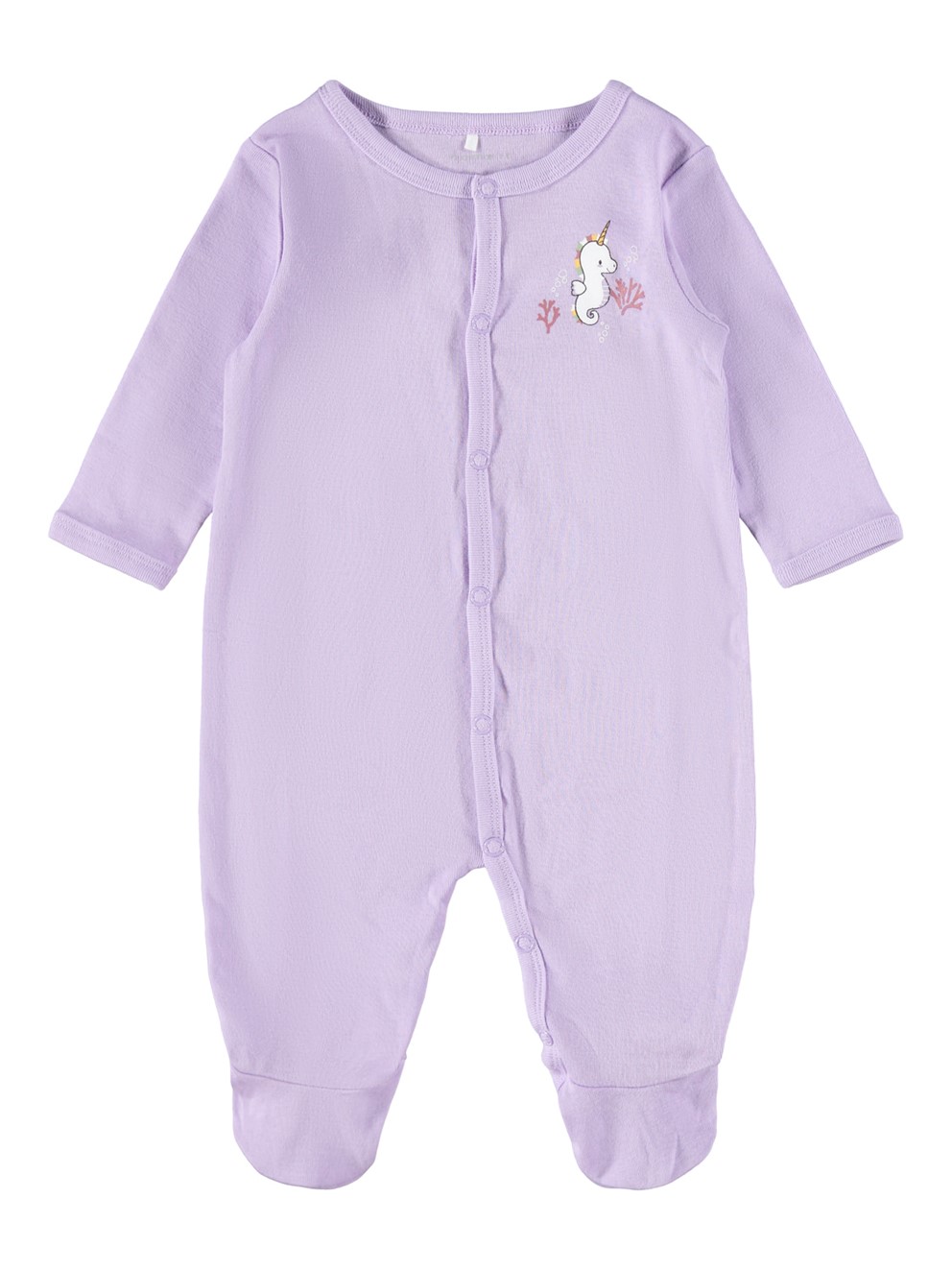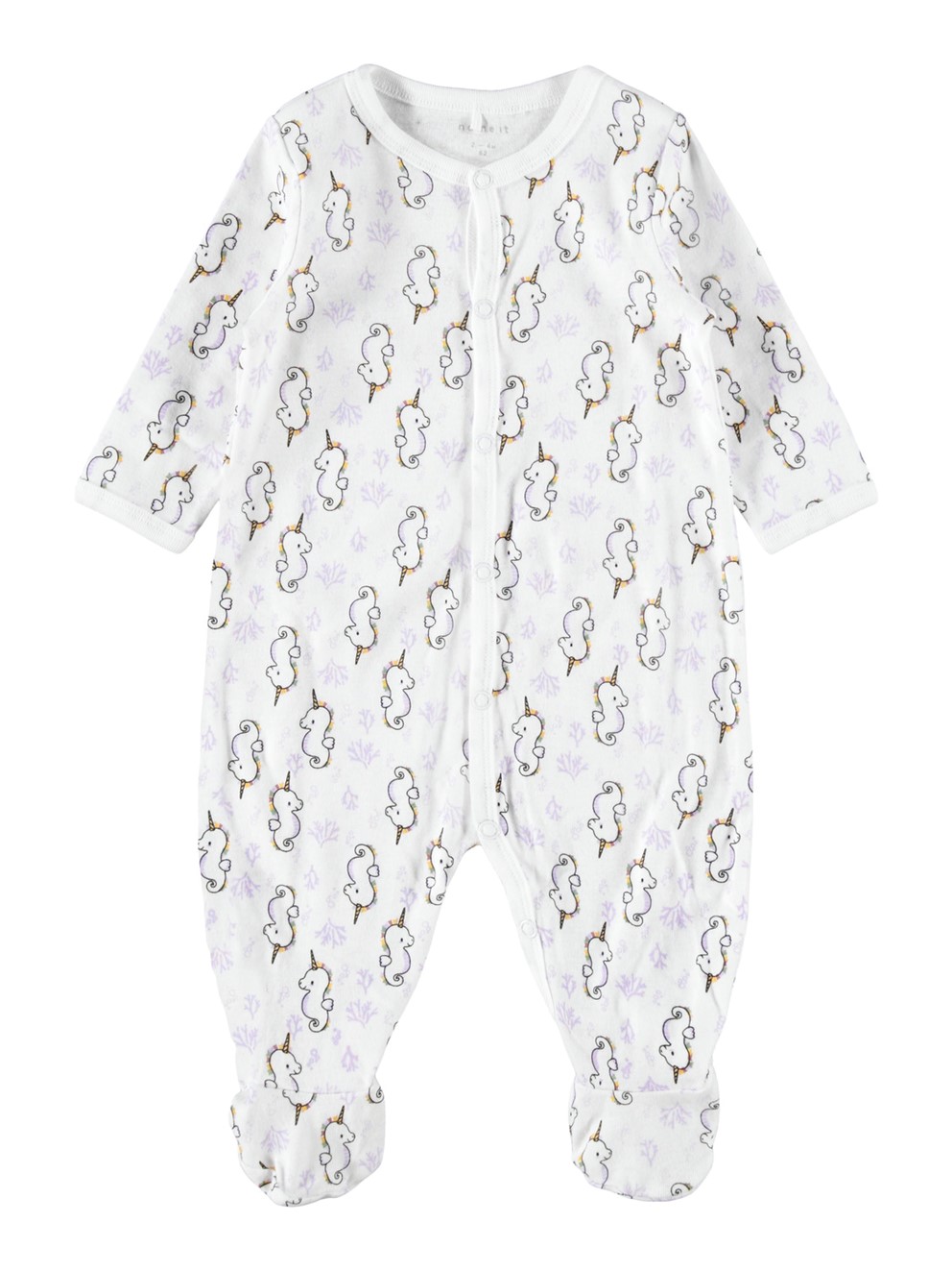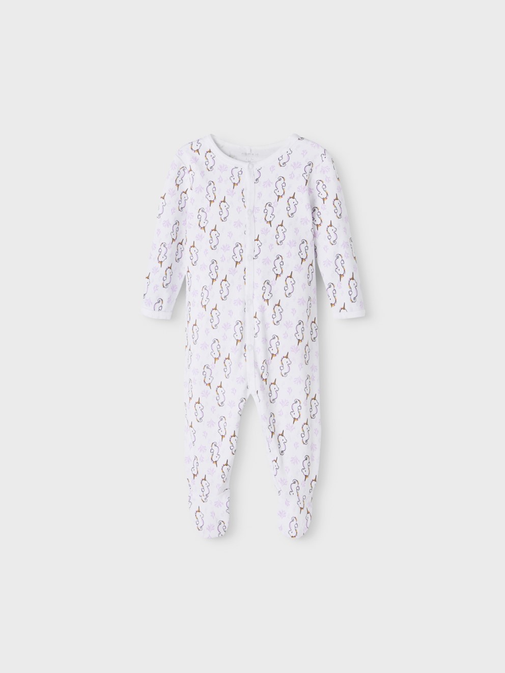 Pysj i 2-pk med fot. Pysjene lukkes med knepping. En med print på hele, og en med lite print på brystet.