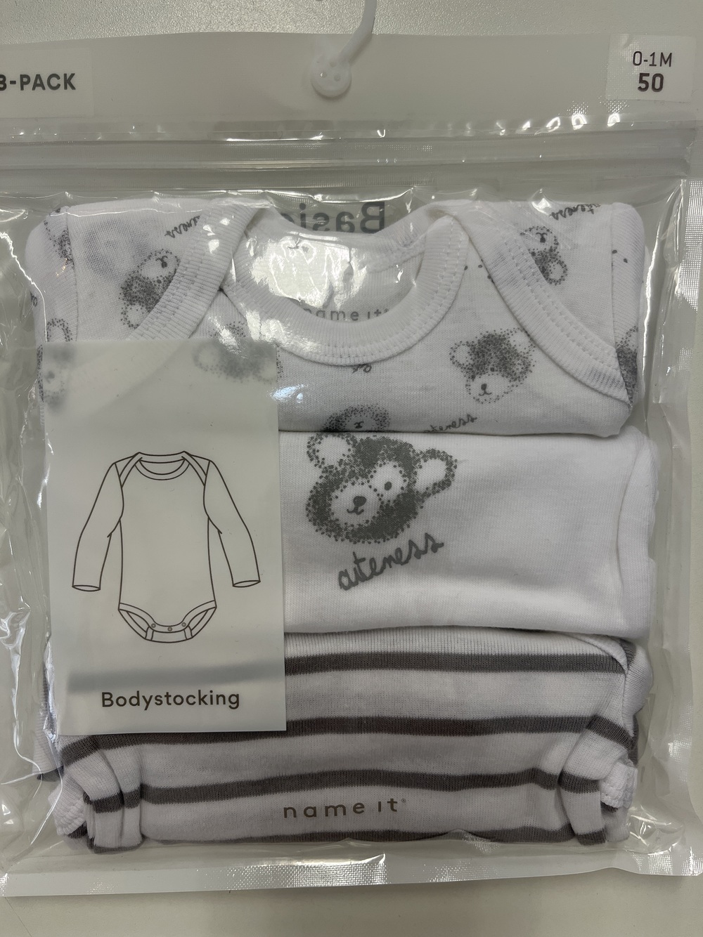 Body i 3-pk. Bodyene har konvoluttåpning på skuldrene.