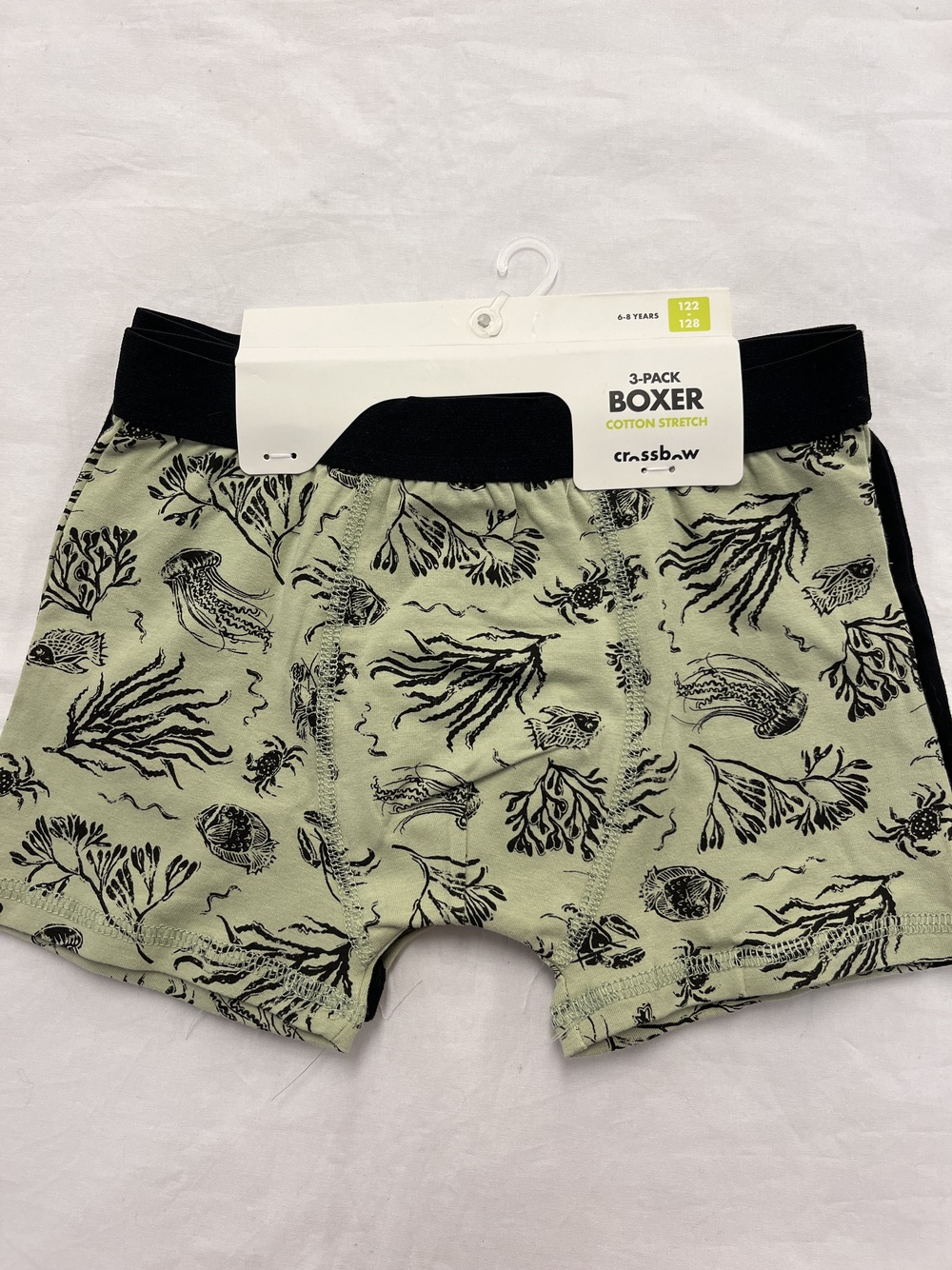 Bokser i 3-pk med 2 mønstra og ein einsfarga. Motiv av dyr og planter i sjøen.