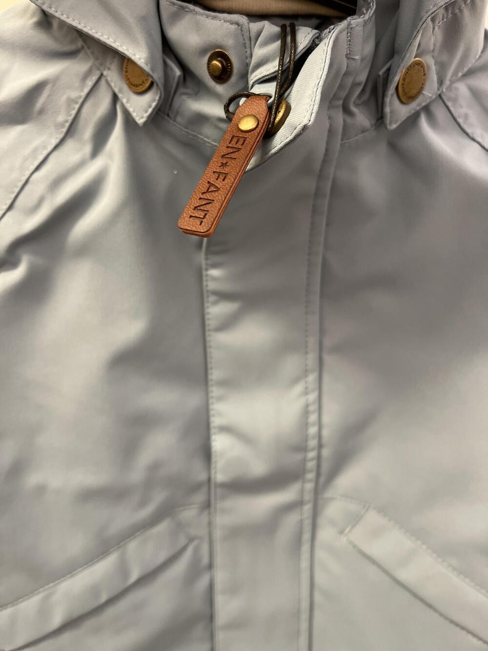 En Fant sommerjakken har en avtagbar hette som Fast med trykknapper i mørk metall. Hetten har en elastisk kant på innsiden og en liten brem som beskytter mot vind og vær. Ermene har brede ribbekanter, og halsen har en indre ribbekant.