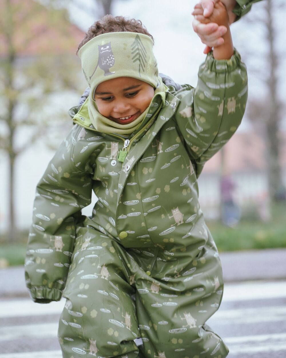 Heilårsregndress Hagl - kolleksjon "Tolvmeterskogen 2025". Den tradisjonelle Heilårsregndressen med vattering i både torso, ermer og bein. Denne regndressen tålar både øspøs regnvêr og mykje leik.