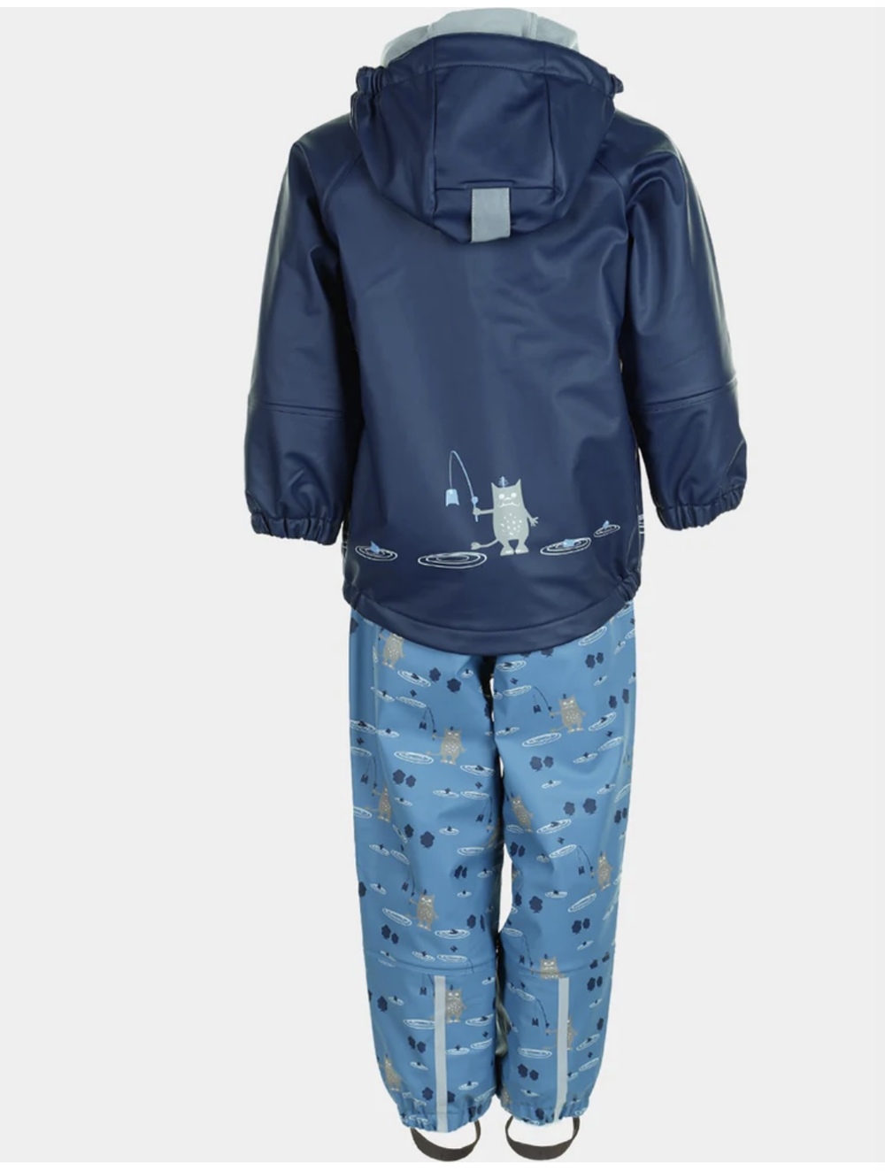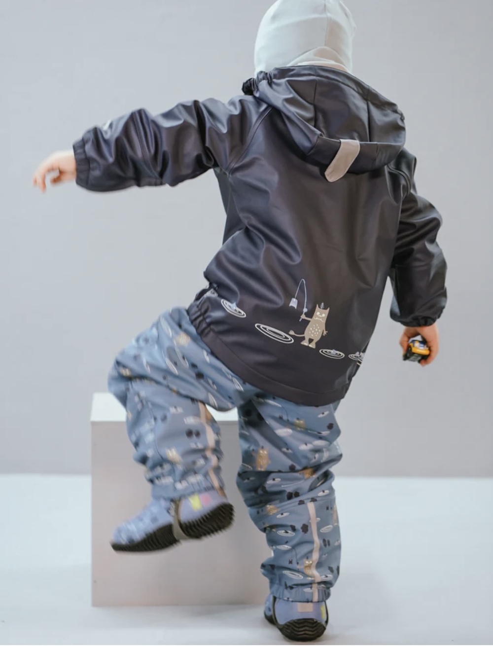 Her er både jakke og bukse i same gode PU kvalitet, med børsta innside. Det er mjuk fleece på insida av kragen og vannstopper finst i både ermer og bein. Her har me slitesterk gummistrikk under føtene, refleksar på jakke og bukse, og mykje moro i print og andre detaljar. Sveisa saumar og sikker hette som er både avtagbar og regulerbar.