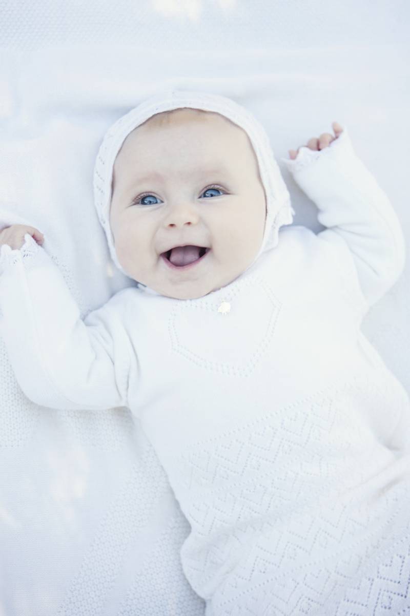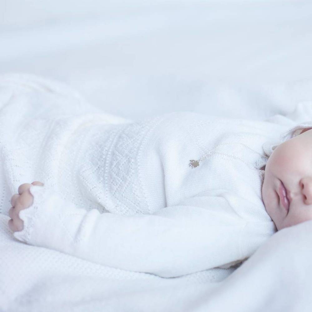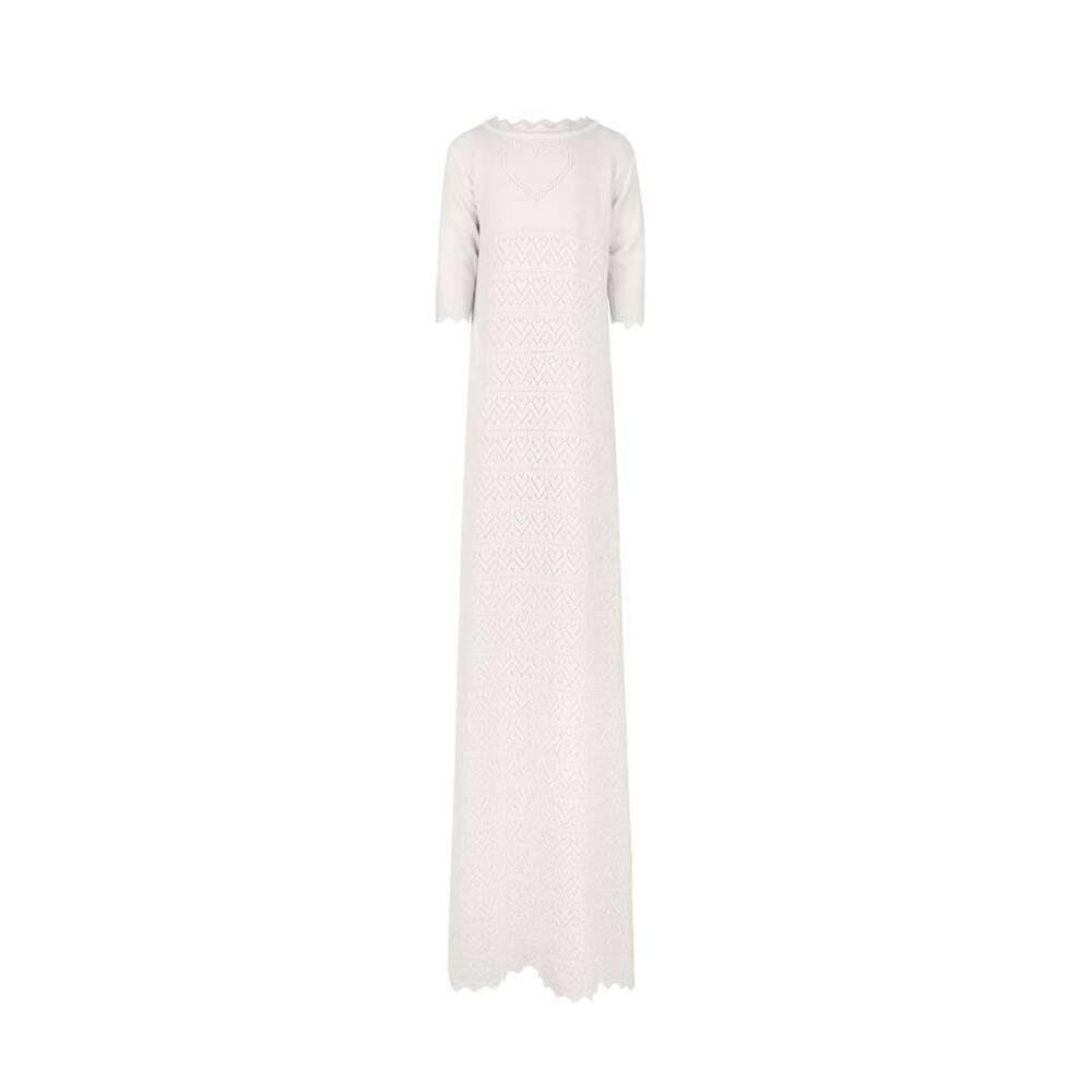 Dåpskjole i Merinoull Hvit. Vakker dåpskjole i 100% merinoull til gutt og jente. Dåpskjolen har nydelig hjertemønster og passer perfekt sammen med dåpsluen fra Lillelam. Kjolen er 104 cm lang i str 68. Det er hemper på kjolen som passer fint til et silkebånd.