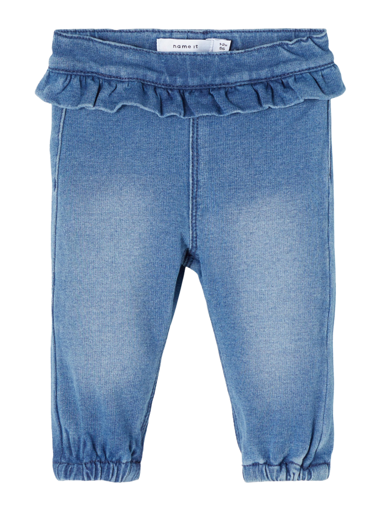 Myk jeans til baby. Denne er som en joggebukse. Søt rysjekant rundt midjen. Kan justeres i midejn med elastisk stramming. Buksen er noe mørkere enn bildet viser.