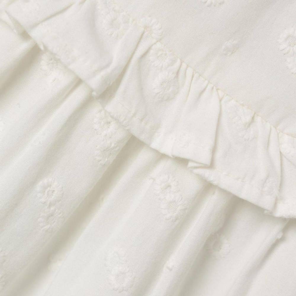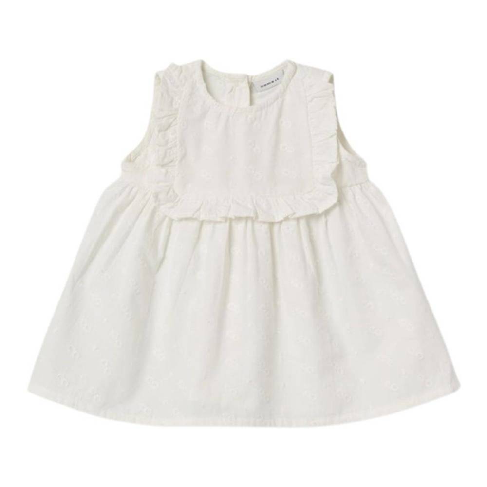 Kjole Baby Delana er en søt hvit ermeløs sommerkjole til de minste fra Name It. Kjolen har fine detaljer i stoffet, og nydelige rysjekanter foran. Knappeåpning bak på ryggen. Perfekt med bloomers under.