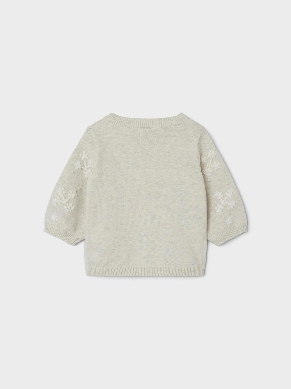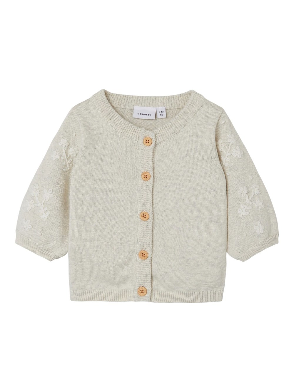 Fin cardigan i tynn strikkekvalitet. Sydde bloster på ermene. Imiterte treknapper i front.