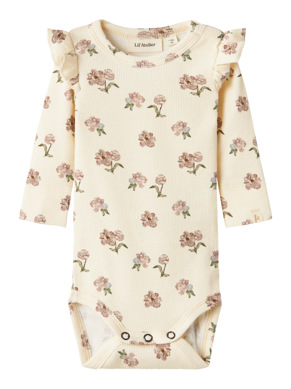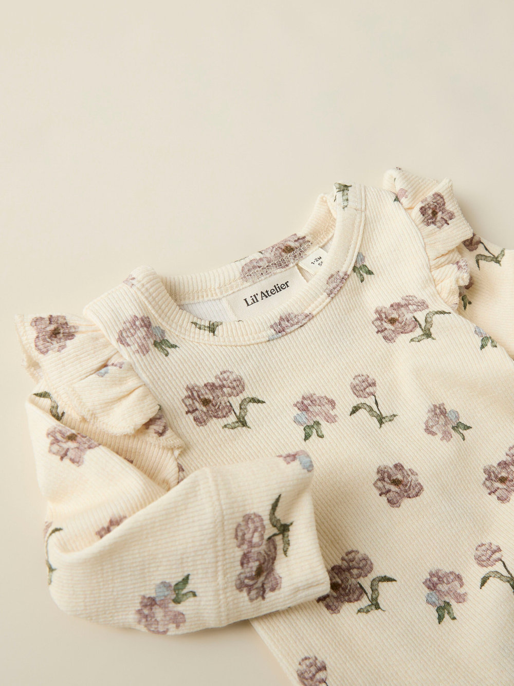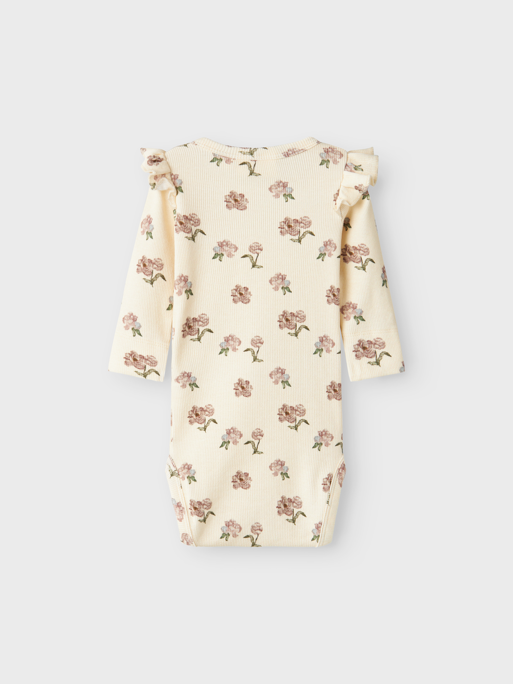 Body med fint print i herlig ribb-kvalitet. Rysjer på skuldrene.