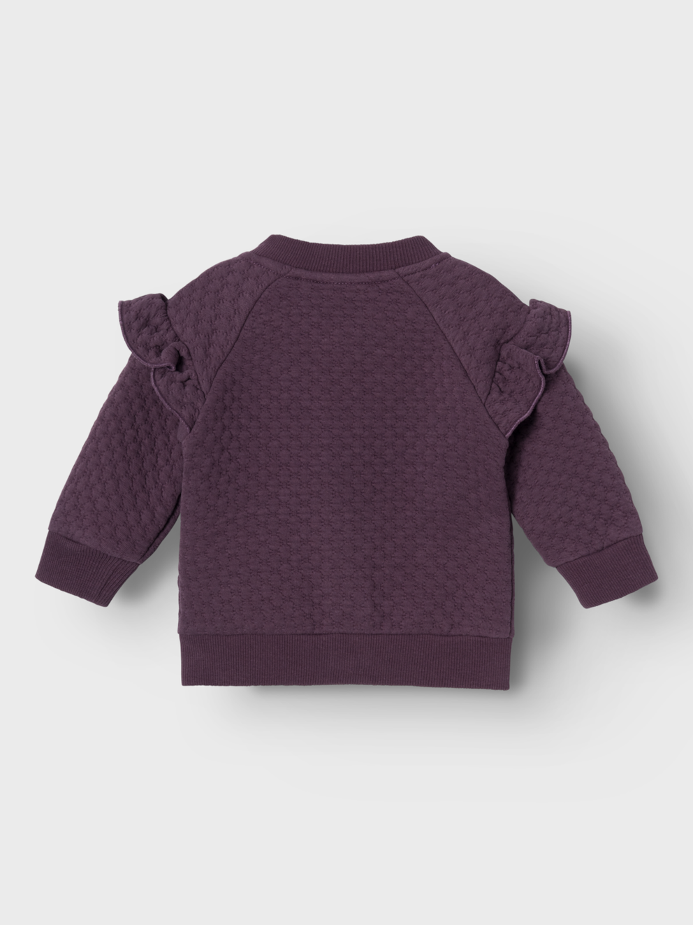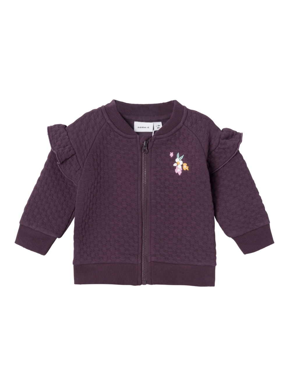 Fin cardigan i tynn quilt-kvalitet. Rysje på skulder. Brodert blomst på brystet.