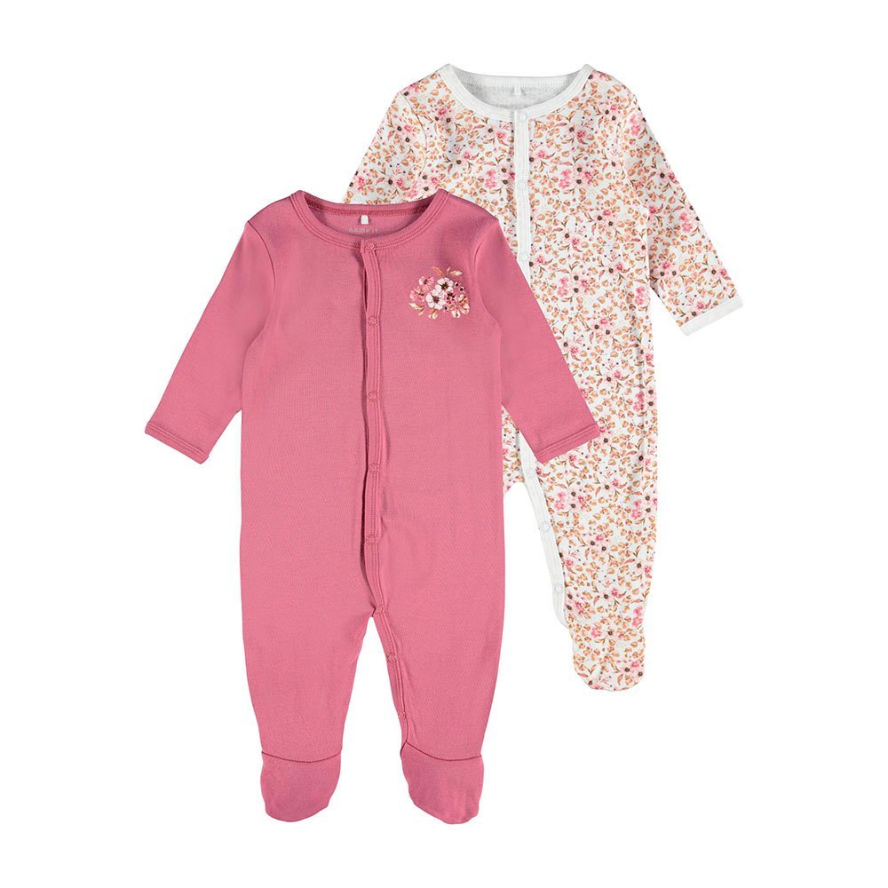 Pysj i 2-pk med fot. Pysjene lukkes med knepping. En med print på hele, og en med lite print på brystet.