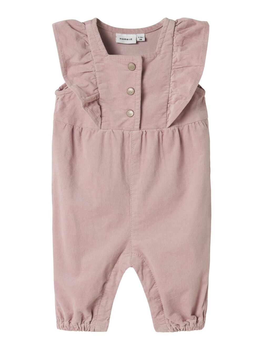 Søt overall i myk cord. Fine detaljer med rysjer ved skuldrene. Knepping i front. Knapper i skrittet for å gjøre bleieskift lettere.