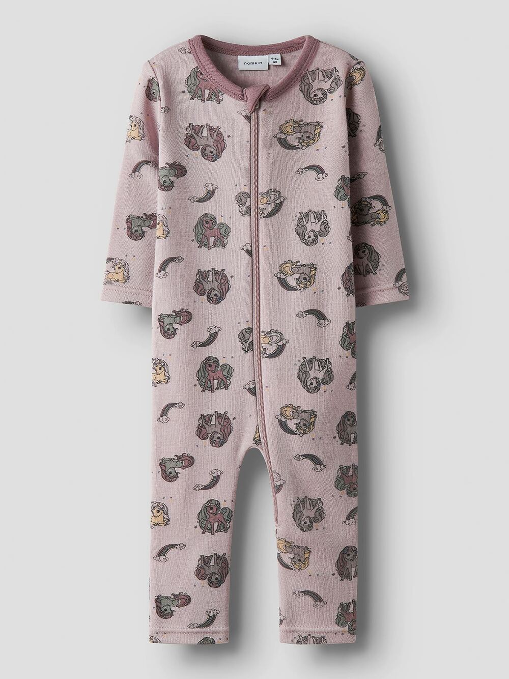 Deilig heldress/pyjamas til baby i myk og pustende merinoull. Den har søtt print over hele med glidelås hele veien.