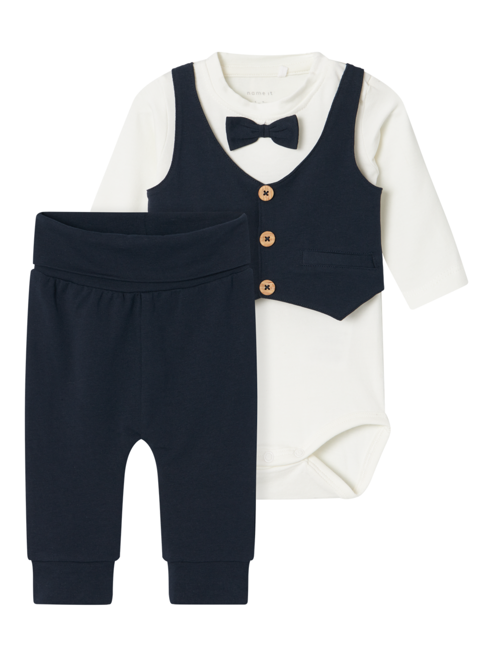Sett med finbukse og body med påsydd vest og sløyfe.
