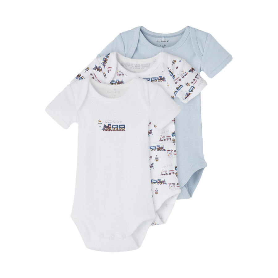 Body i 3-pk med kort arm. Her er det en med all-over-print, en med et mindre print i front og en ensfarget. Konvoluttåpning på skuldrene.