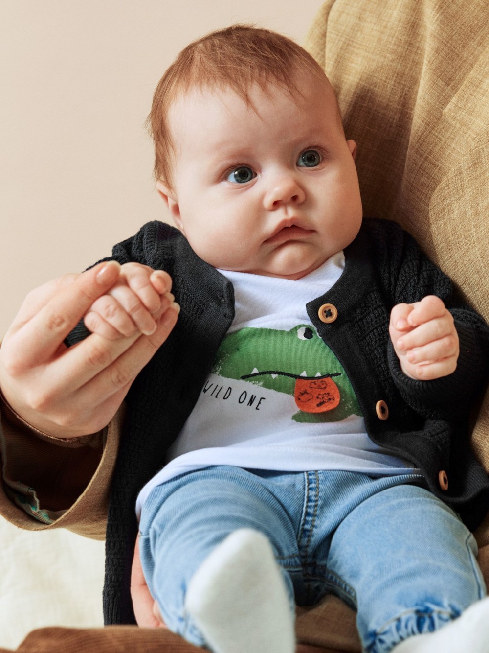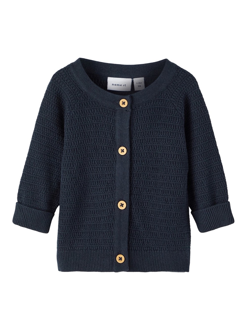 Fin strikkejakke til baby. Imiterte treknapper i front.