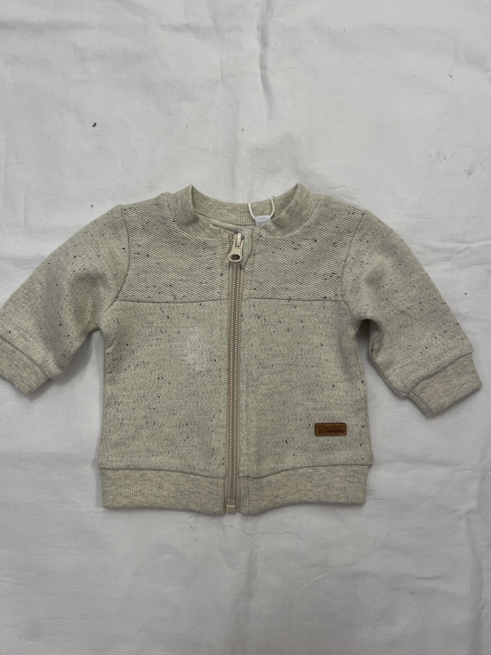 Fin cardigan i melert bunnfarge. Fin detalj med skinnlapp med logo. Hakebeskytter med glidelåsen. Finnes matchende bukse.