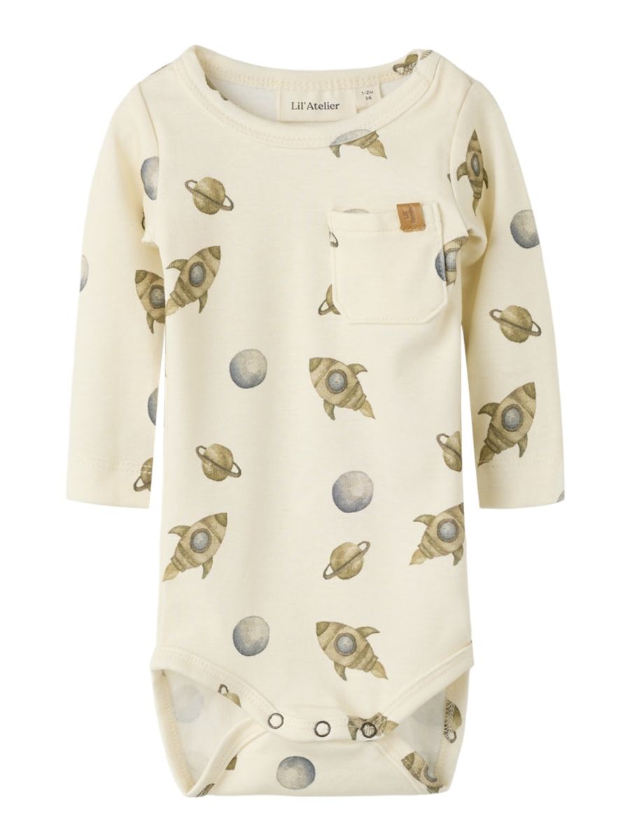 Layo body fra Lil`Atelier med romskip og planeter, fantastisk myk kvalitet med brystlomme og trykknappåpning på skulder og i bunn.
