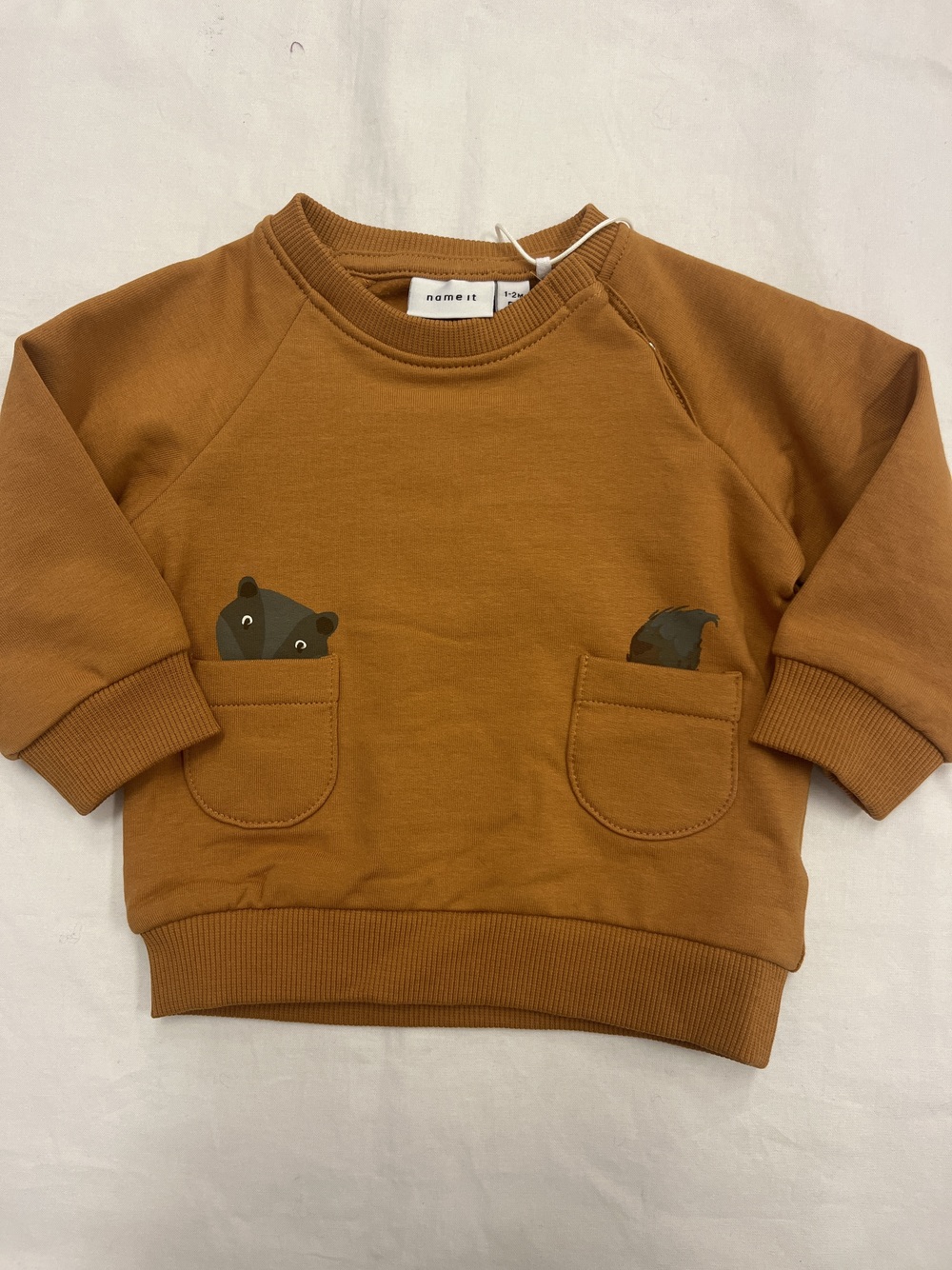 Søt genser til de minste. Små lommer i front, med søt detalj med print av dyr som stikker opp av lomma. Børstet innside som gjør genseren ekstra myk mot huden.