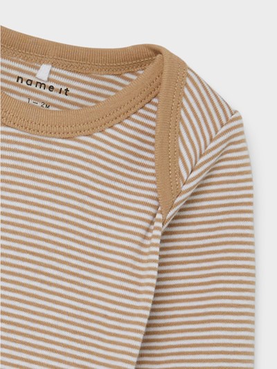 Body i 3-pk med søtt motiv i duse farger. Her får du en hvir, en med teddybjørner i bruntone og en brun/hvit stripede. Bodyene har konvoluttåpning på skuldrene.