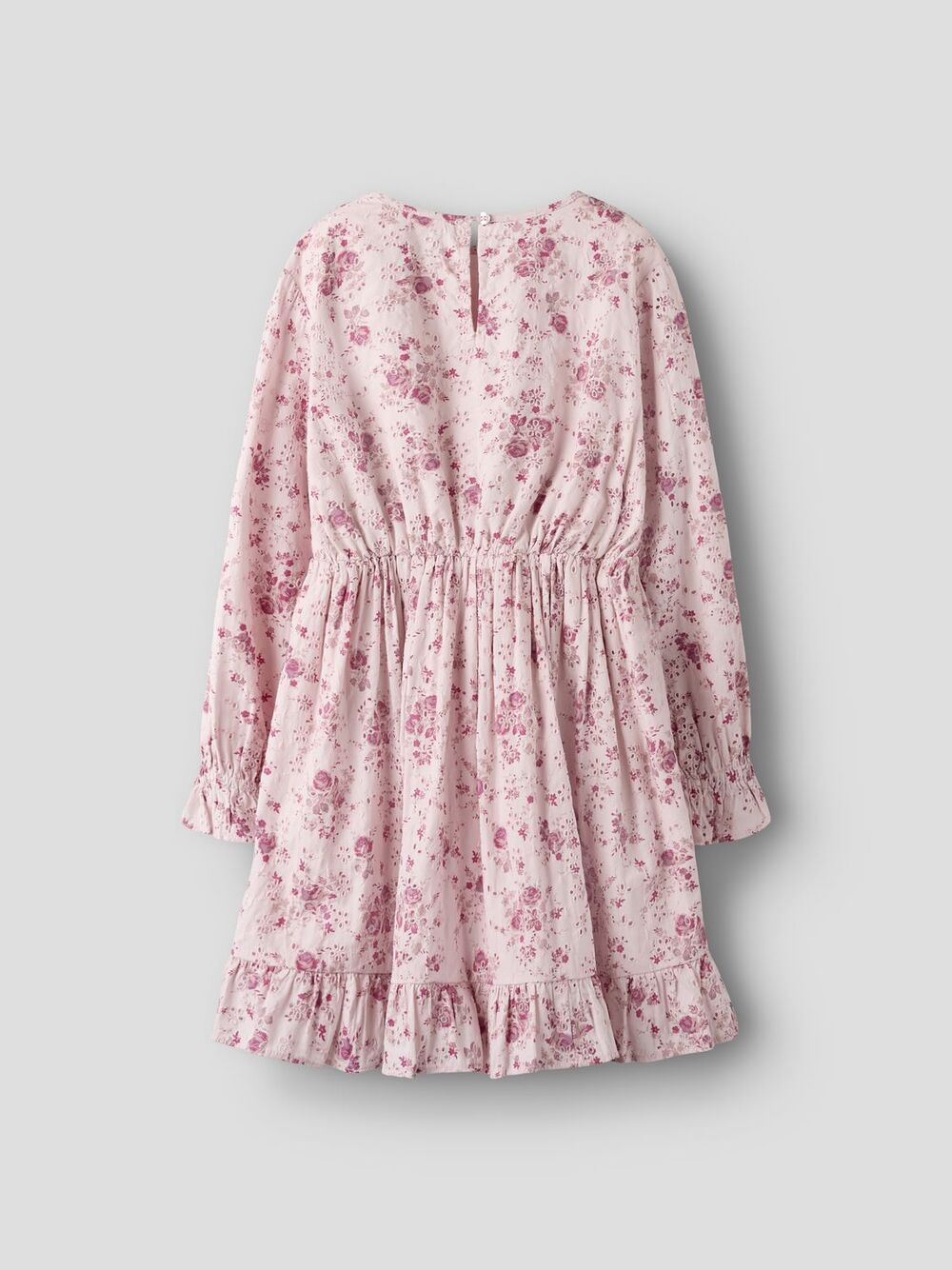 Delikat kjole i lyserosa/lilla med blomsterprint — myk og økologisk for aktive jenter.