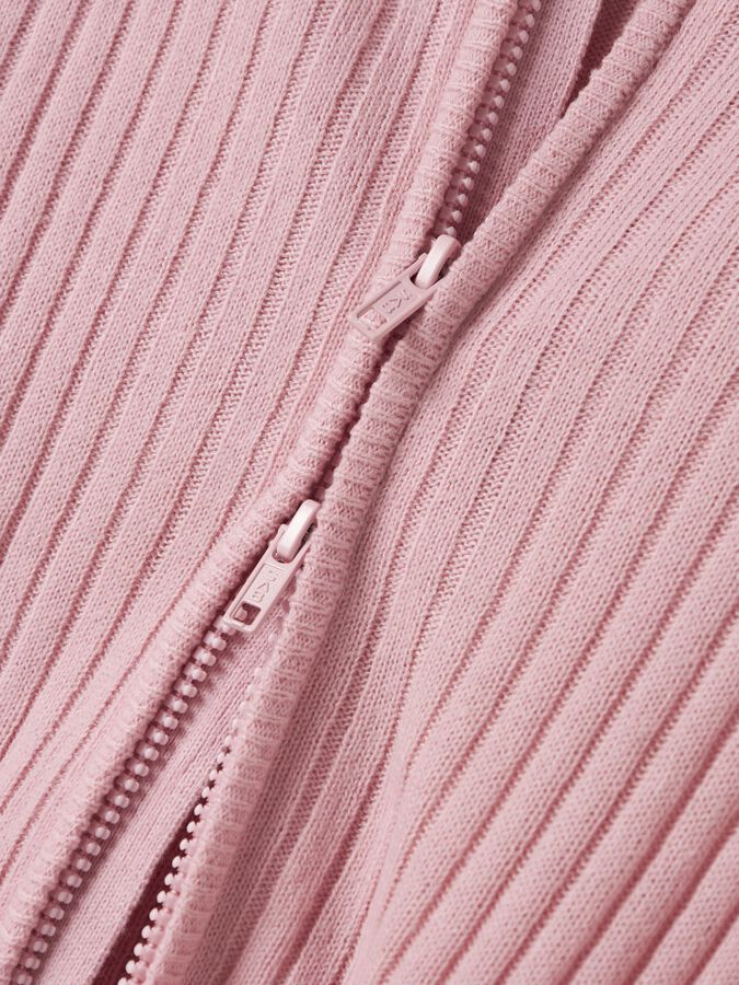 Cradigan med glidelås i front. Ribbestrikk. Litt kortere modell.