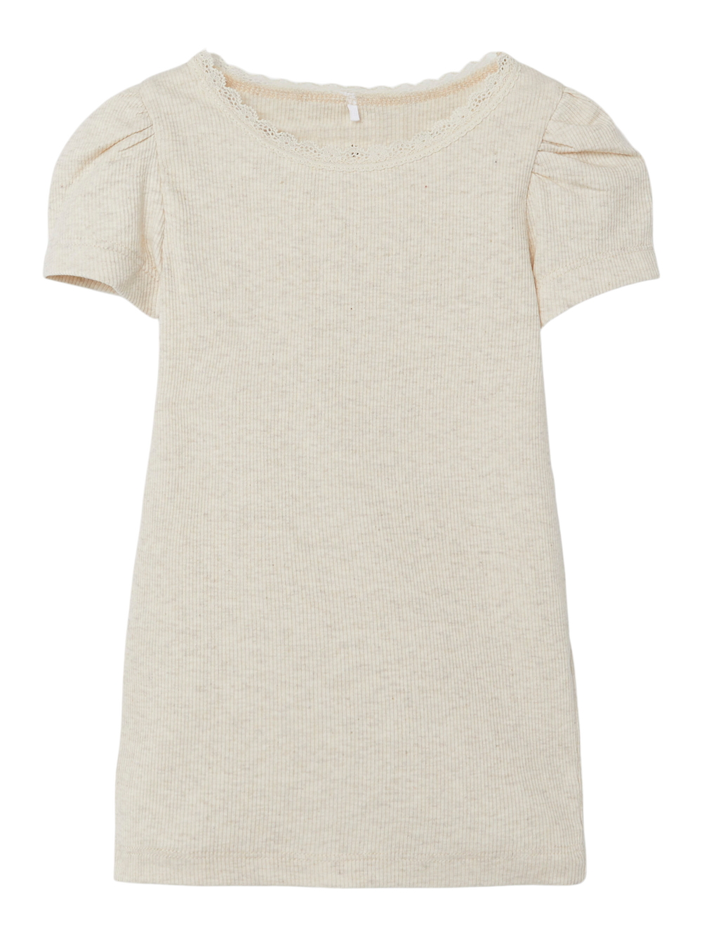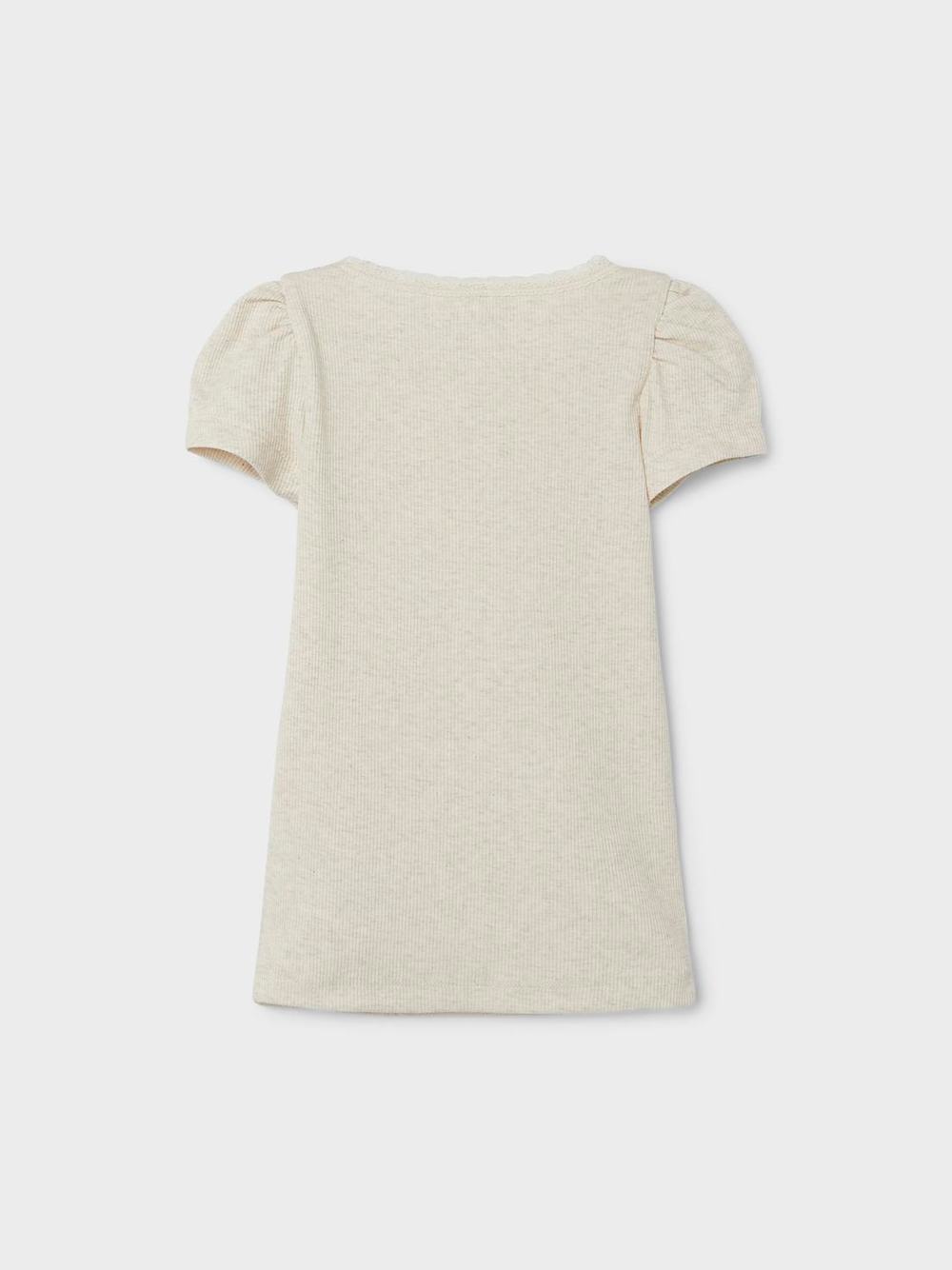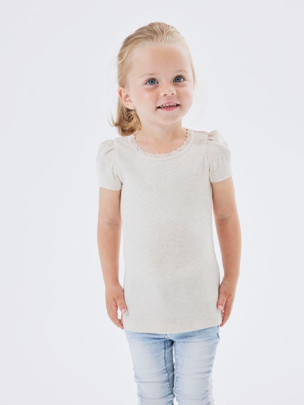 T-skjorte i herlig ribb-kvalitet. Liten pufferme, og blonde rundt halsen.