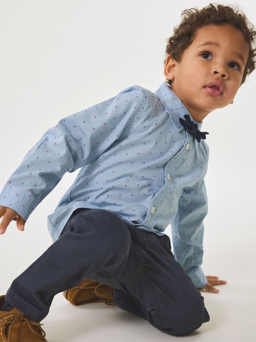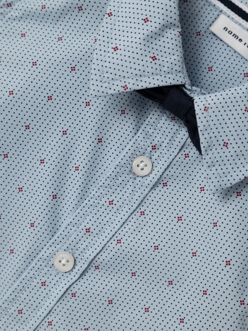Skjorte med lyseblå bunn og mønstring. Men sløyfe som kan tas av.