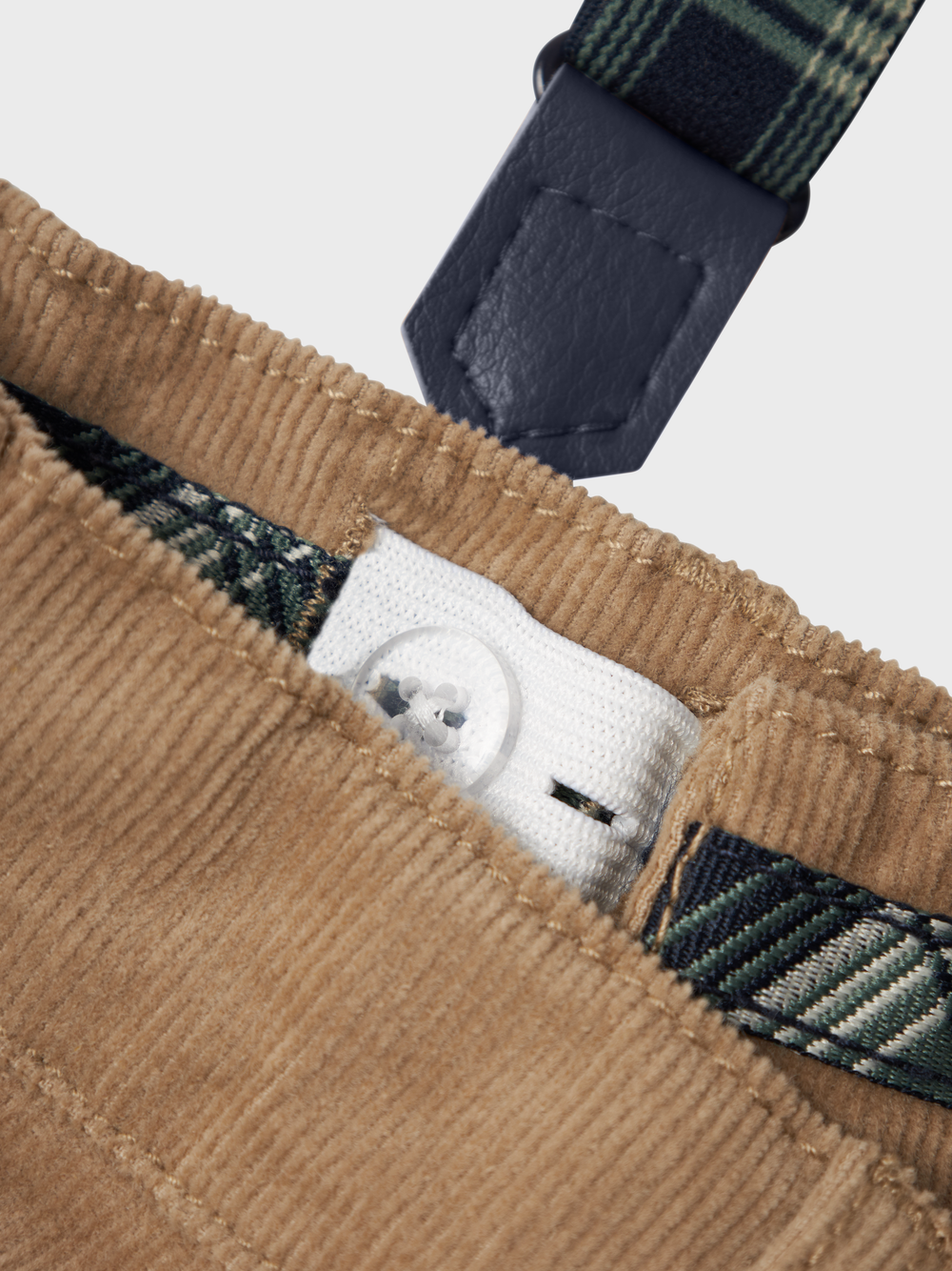 Bukse i cord. Fin detalj med seler med ruter. Selenbe kan tas av og kan justeres i lengde. Buksen kan justeres i midjen med elastisk stramming.