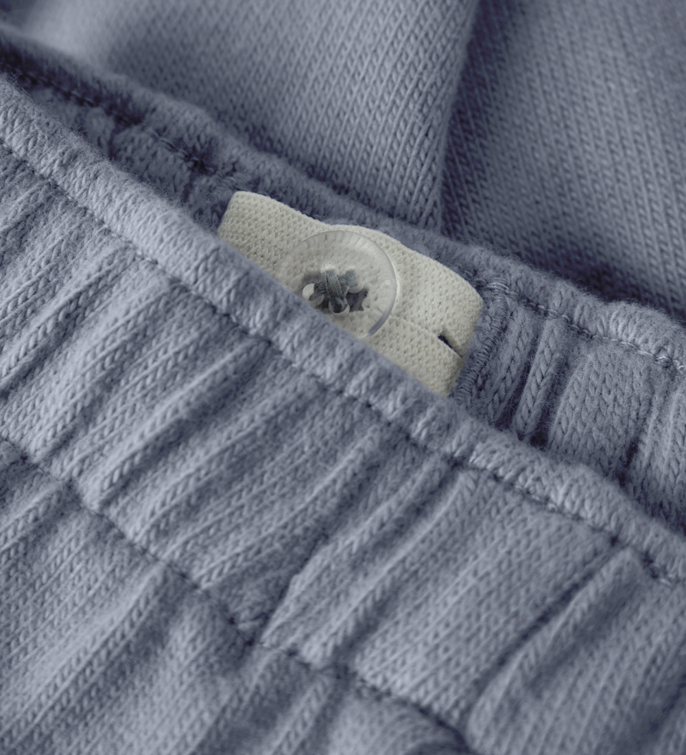 Komfortable bukser fra Lil' Atelier i lyseblå strikk. Buksene har elastisk midje som kan justeres med knapper innsiden. De har dekorative knytinger foran og en avslappet passform.
