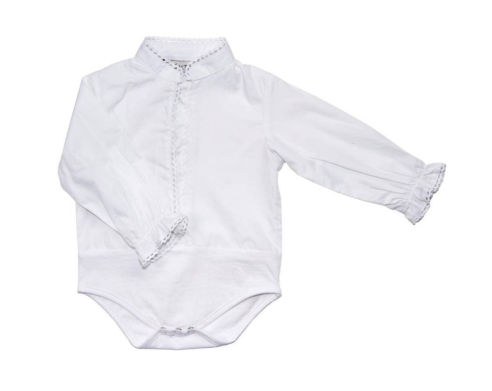 Bunadsbody fra Salto. Ermeavslutninhen er som på en skjorte, slik at denne passer best til gutt.
