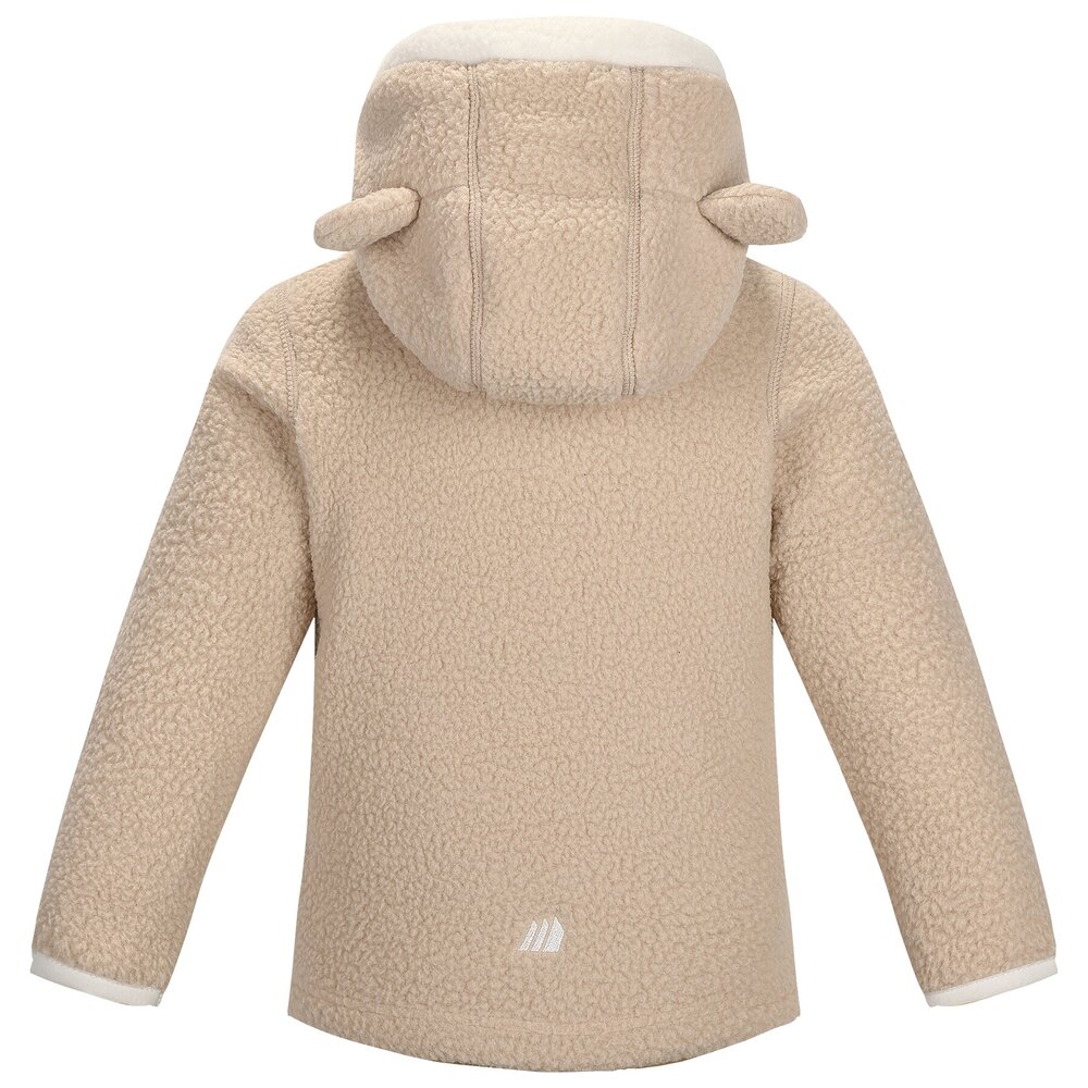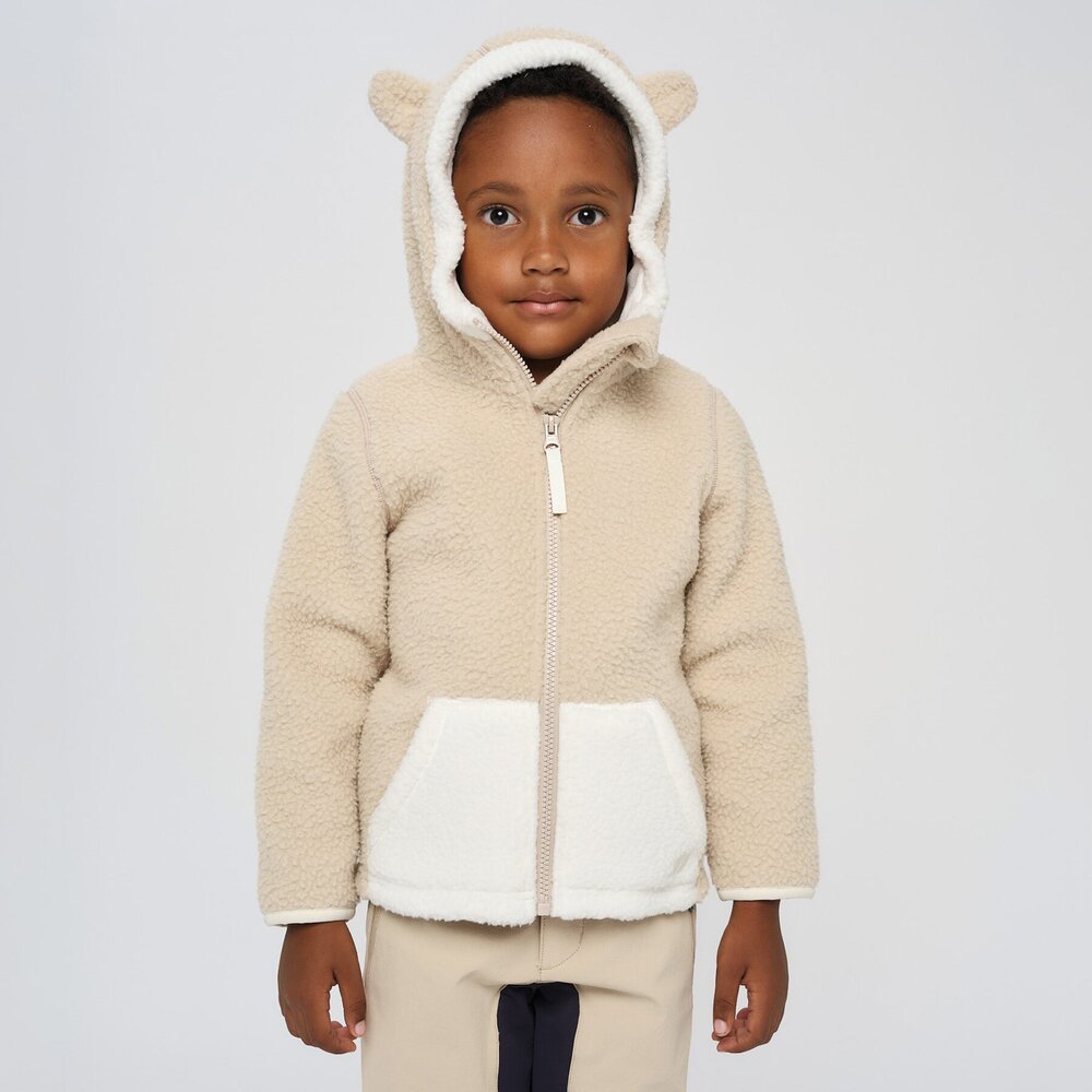 En myk pilefleece-jakke som holder barna varme gjennom sesonger. Den har en søt hette med små bamseører og en litt forlenget rygg for ekstra komfort.