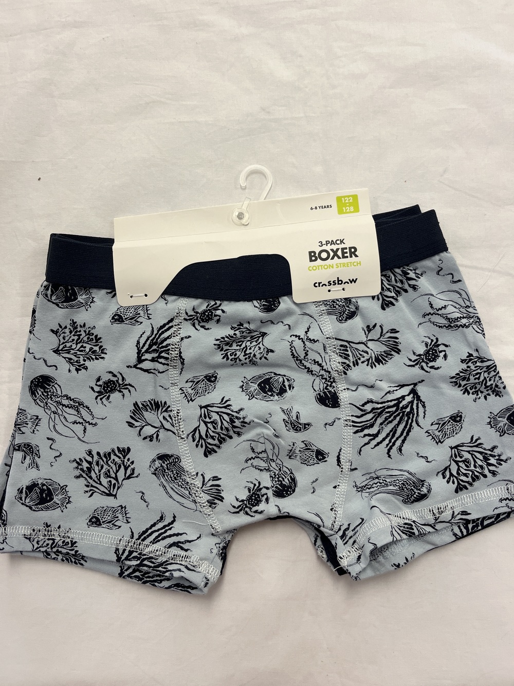 Bokser i 3-pk med 2 mønstra og ein einsfarga. Motiv av dyr og planter i sjøen.