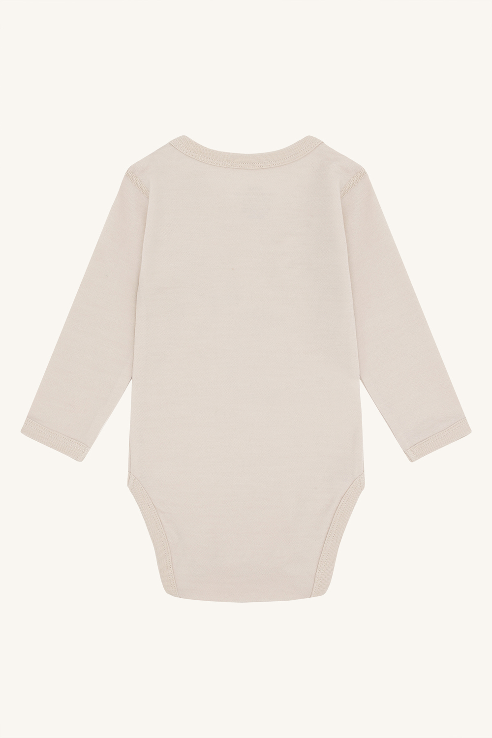 Body med dyreprint. Ytterside i ull, innside i bambus. Dette gjør at produktet skal kunne brukes av barn som er sensitiv mot å ha ull rett mot huden.