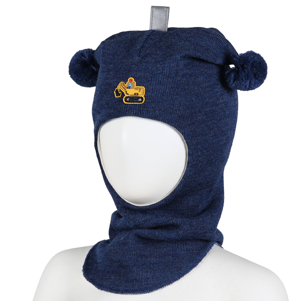 Varme og vindbeskyttelse for små eventyrere i flott blå farge med gravemaskin-detalj.