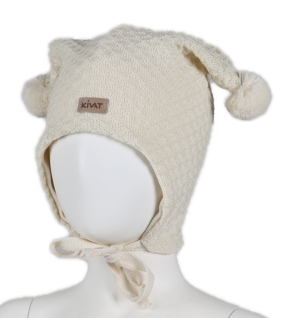 Fin vinterlue fra Kivat med dusker og knyting. Vaffelmønster. Skinnlapp i front.