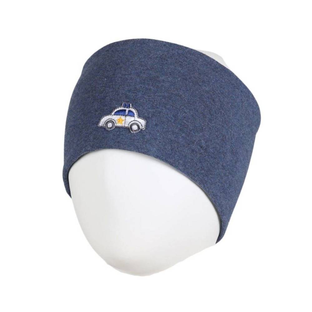 Pannebånd med politibil-figur påsydd i front.