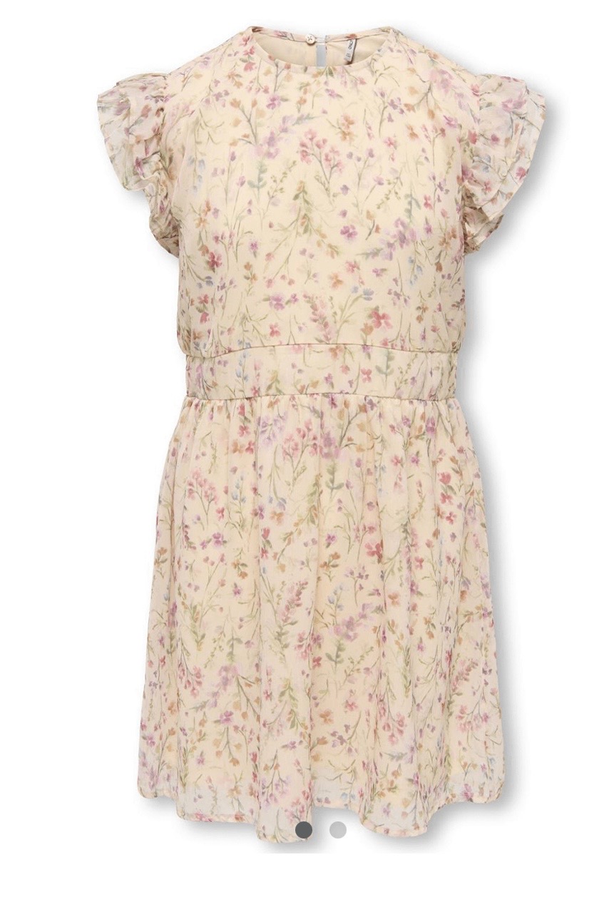 Utrolig søt kjole til barn og ungdom i mykt materiale. Kjolen har fint blomsterprint over hele og volanger over skuldrene. Myk strikk i midjen som gir fint fall.