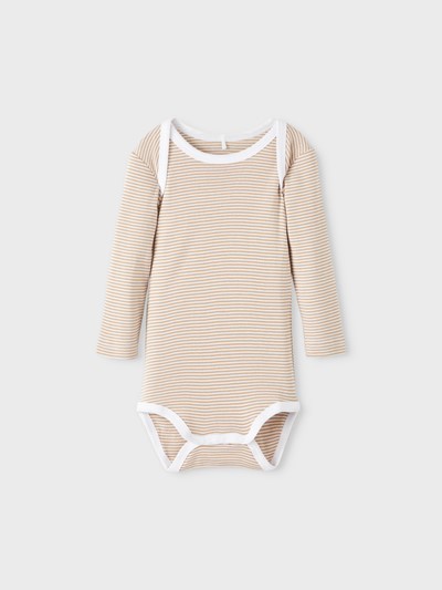 Body i 3-pk med søtt motiv i duse farger. Her får du en hvir, en med teddybjørner i bruntone og en brun/hvit stripede. Bodyene har konvoluttåpning på skuldrene.