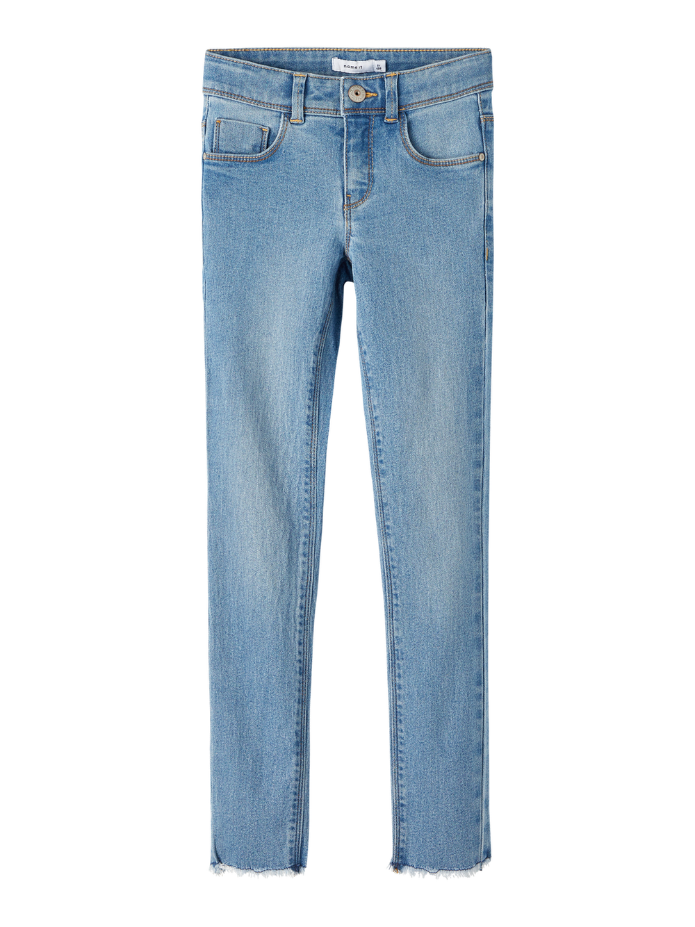 Jeans i skinnymodell. Raw-kant nede. Buksen har stretch. Kan justeres i midjen med elastisk stramming.